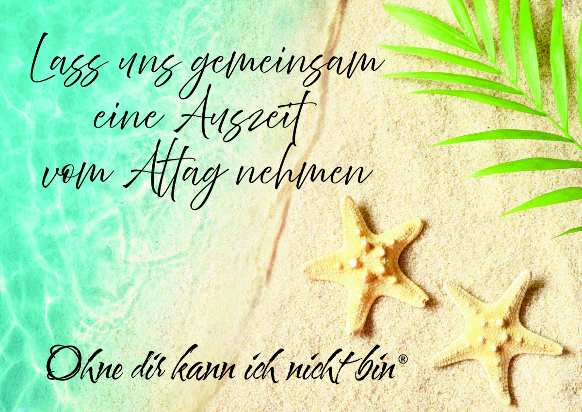 Mit dem berührenden Text 'Lass uns gemeinsam eine Auszeit vom Alltag nehmen' und 'Ohne dir kann ich nicht bin' auf einem harmonischen Hintergrund in sanften Türkis- und Sandtönen, verziert mit tropischen Palmblättern und zarten Seesternen, vermittelt sie eine entspannte Urlaubsatmosphäre.